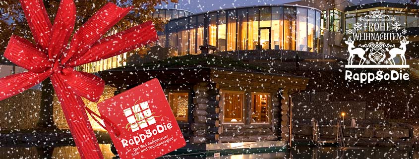 Mit einem RappSoDie Wellnessgutschein liegen Sie zu Weihnachten nicht nur voll im Trend, sondern schenken erholsame und genussvolle Stunden im Wellness-Paradies RappSoDie. Schenken Sie Ihren Liebsten Entspannung pur und bestellen Sie ganz nach Ihren Wünschen online oder auch gerne per Telefon – 07264 2069330 einen RappSoDie Wellness-Gutschein für erholsame Stunden. Jederzeit auch sofort an der Kasse erhältlich.